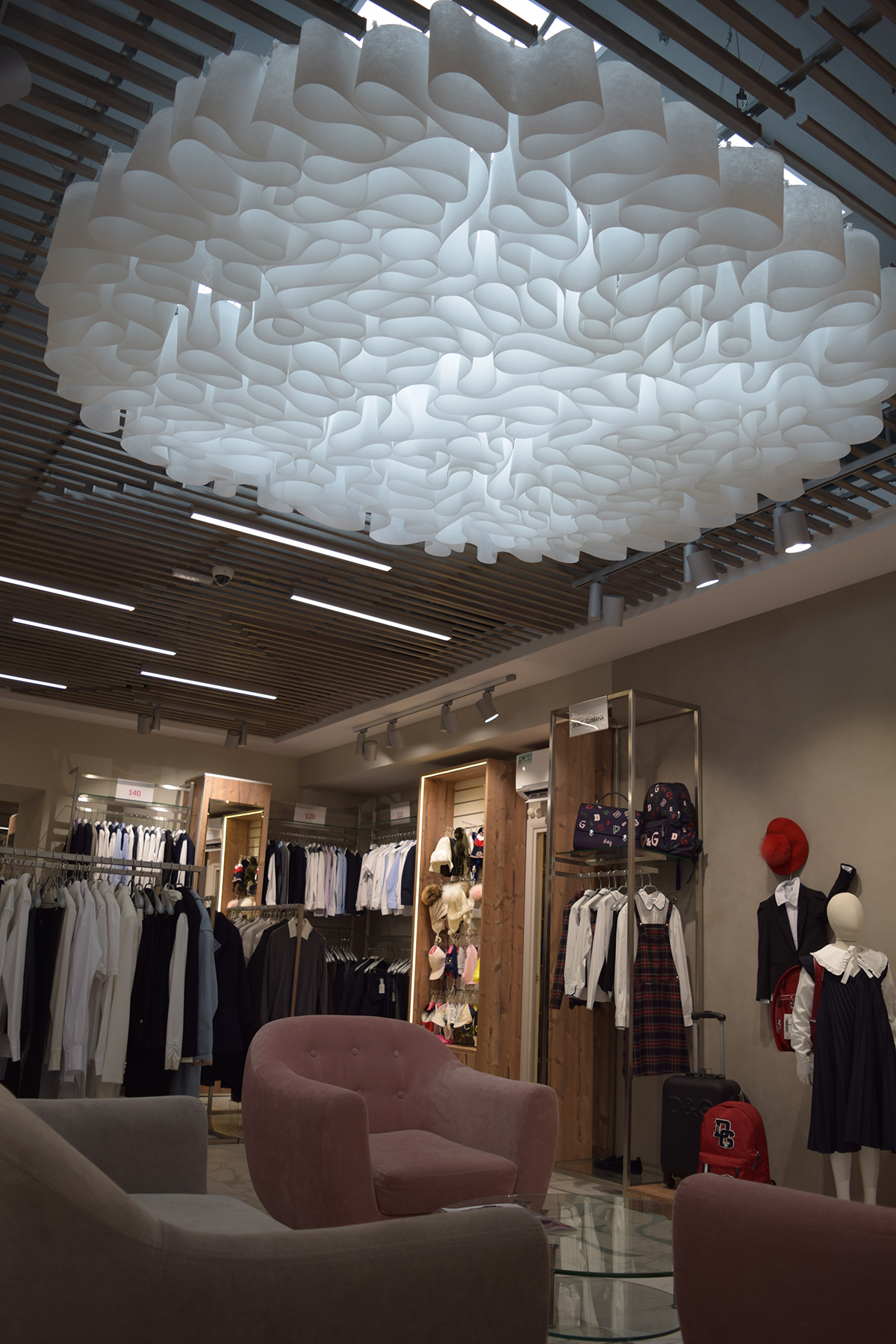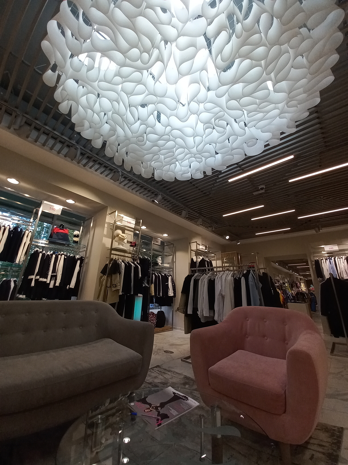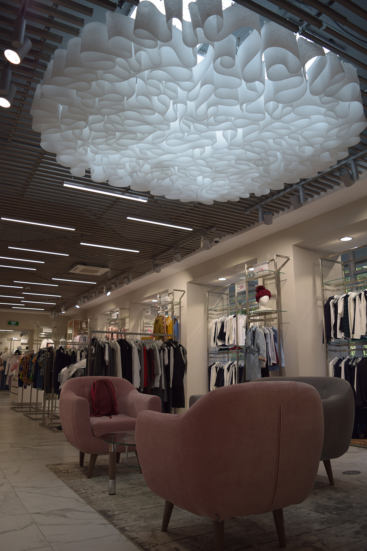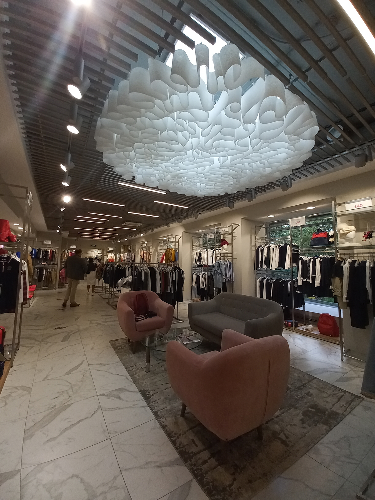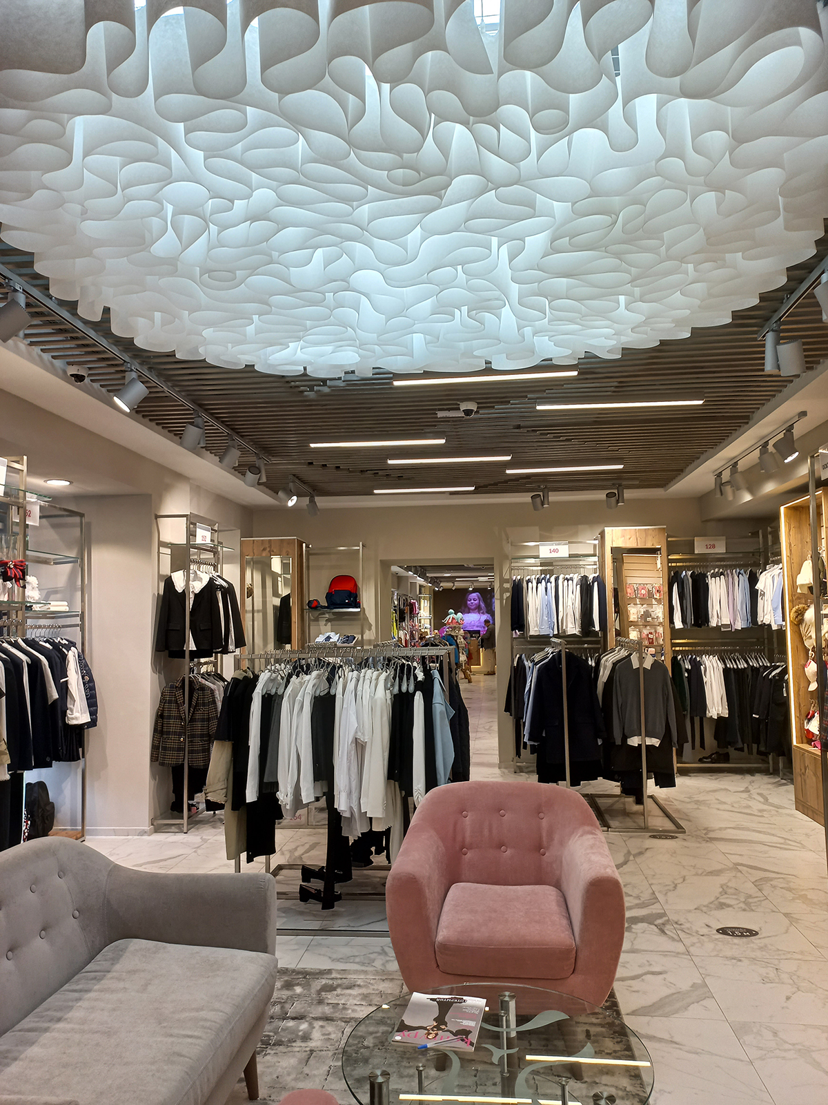 Photos of our ceilings in fully completed and furnished interiors are quite rare: usually, installation is carried out when the premises are still in a “raw” stage, with construction and design work unfinished. An exception is the interior project for the well-known “Kangaroo” retail chain in Moscow (23/7 Komsomolsky Prospekt), which we are pleased to present here. The store’s design project was created by Victoria Nazarova.