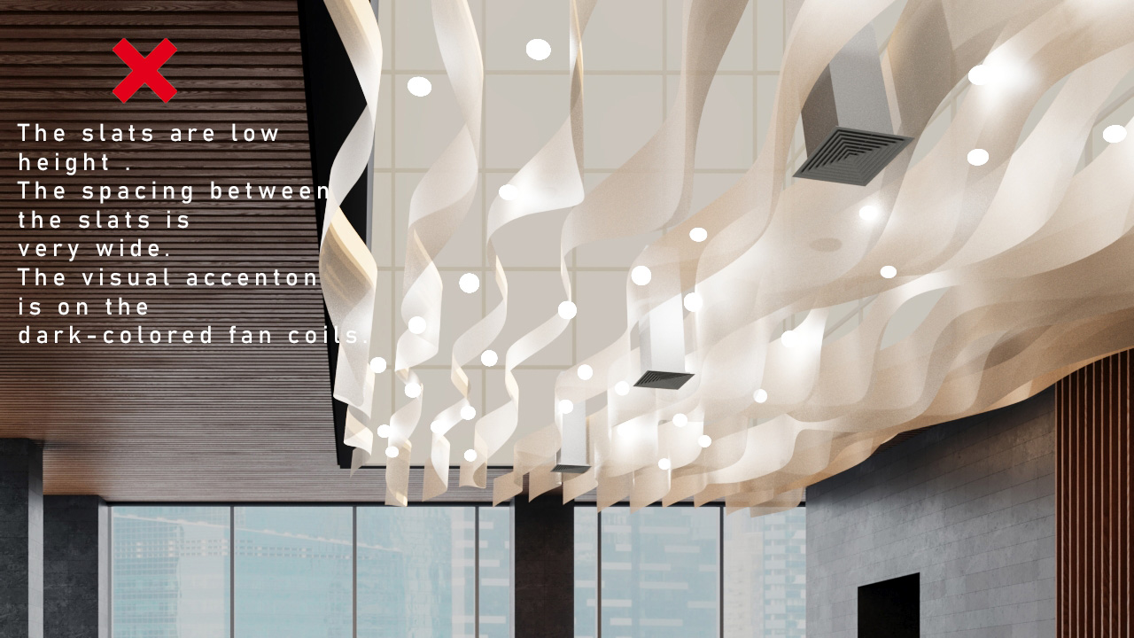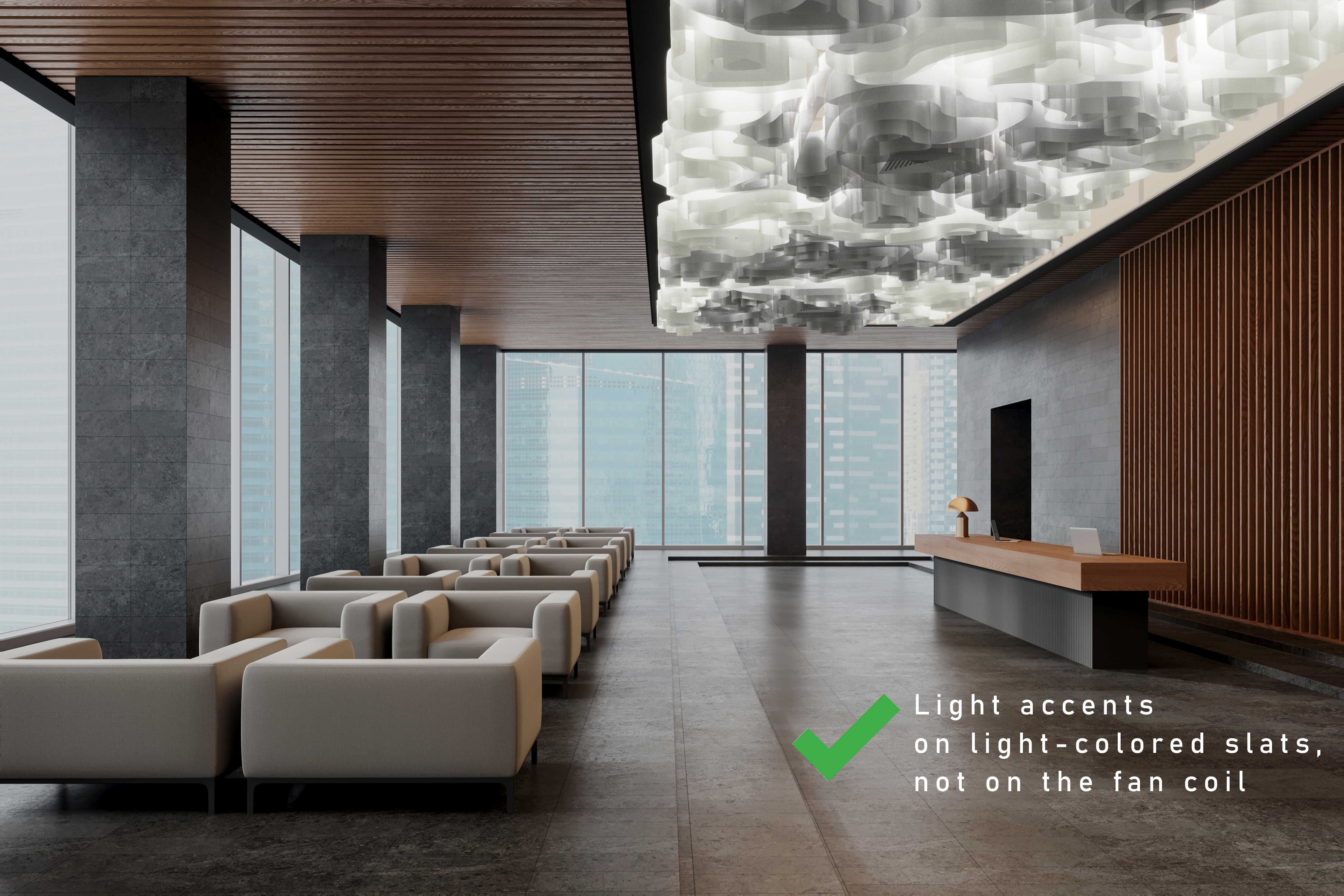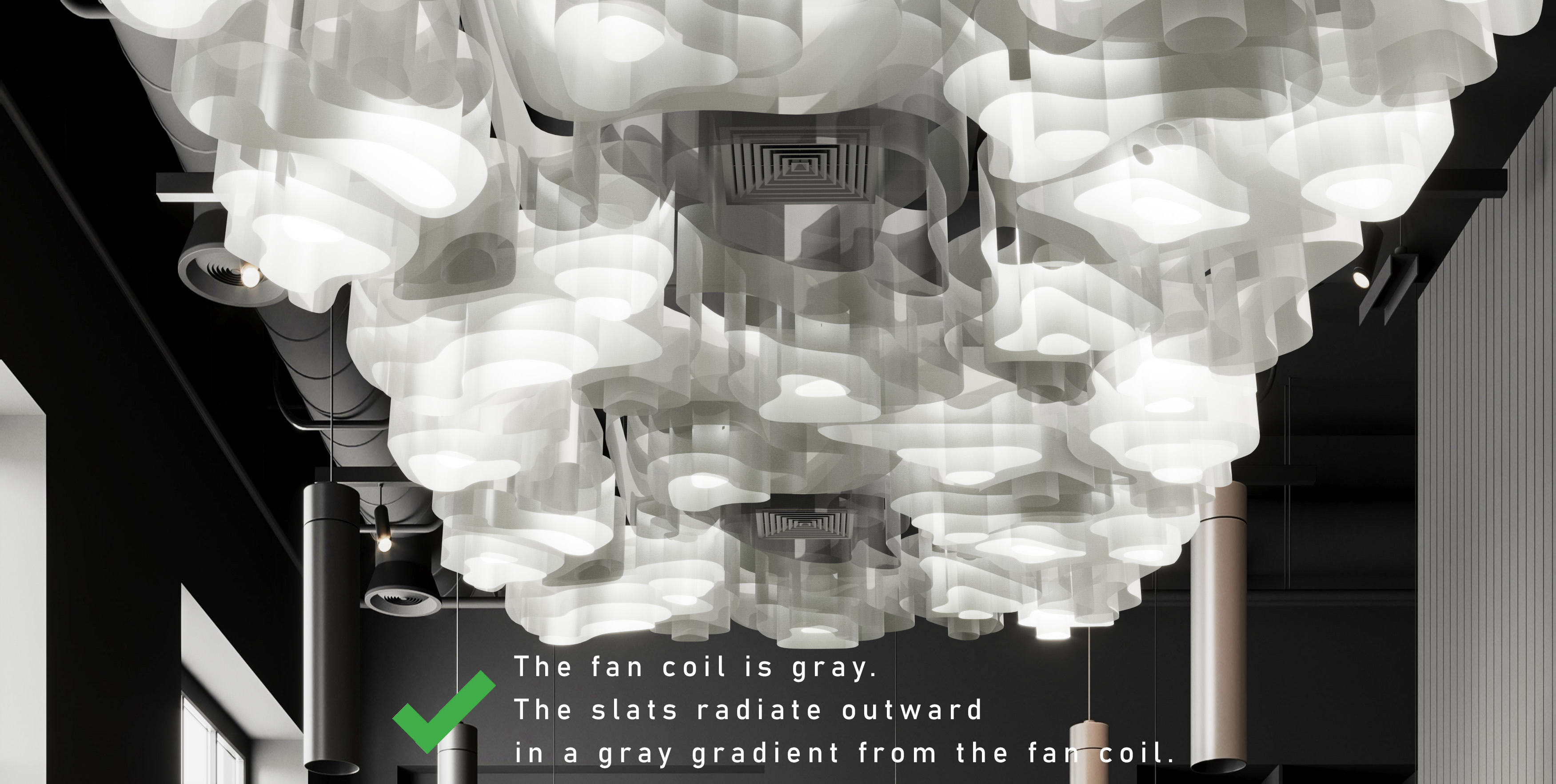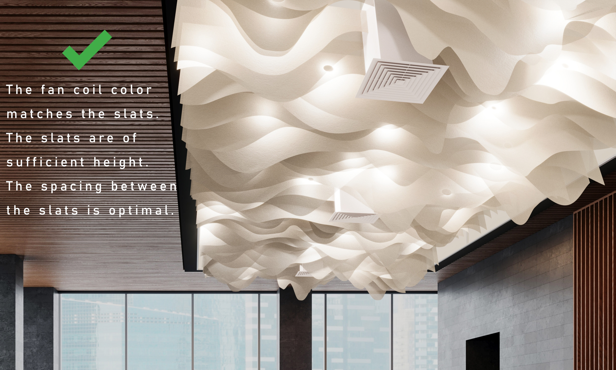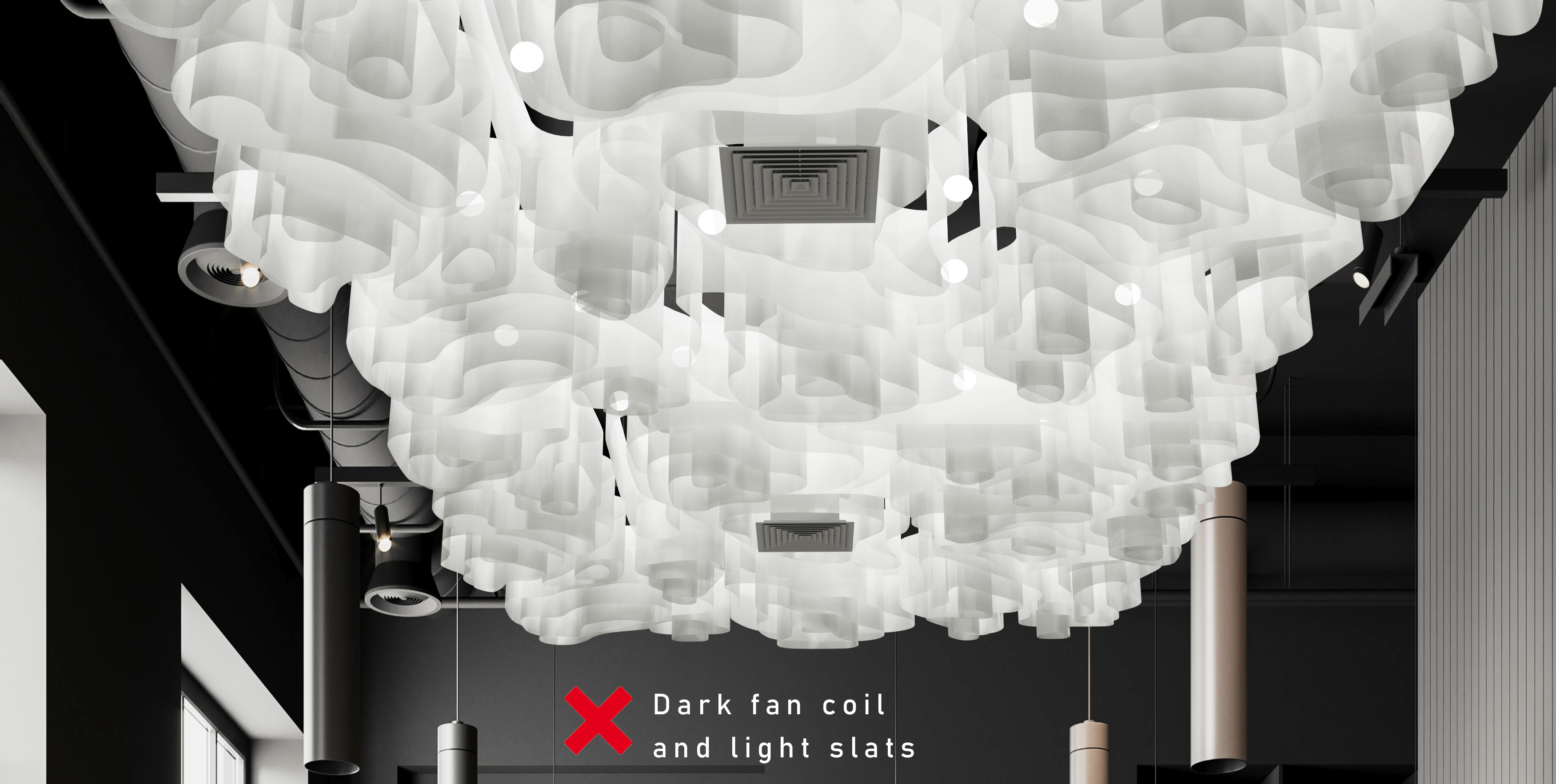 Gradient coloring of ceiling slats — from darker shades at the center (the area with ventilation and fan coils) to lighter ones at the edges. This technique visually masks the equipment while creating an artistic accent.