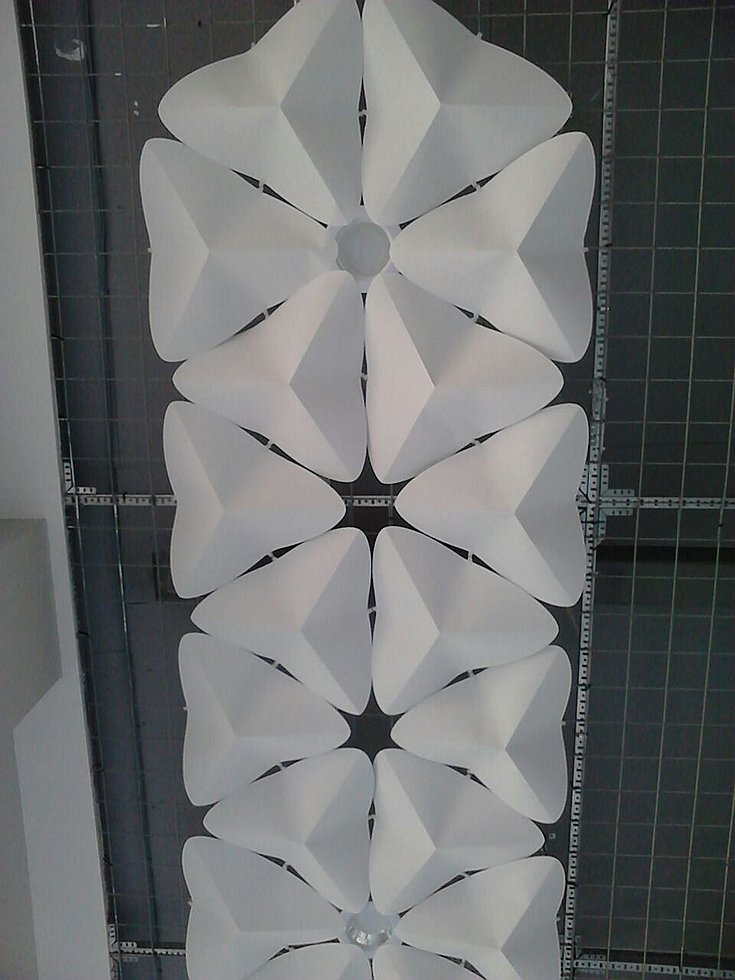 The ceiling was handcrafted from 3,062 petals, each cut from Drop Paper® 80 g/m² (learn more about the material), and fixed in three points onto a pre-stretched galvanized grid. A spotlight was placed in the center of each flower, creating both a decorative and functional effect.
