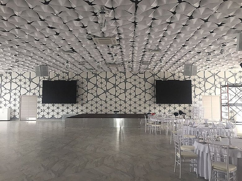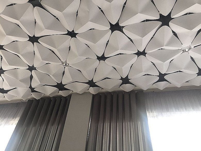 The result is a ceiling that is not only visually striking but also fire-safe: Drop Paper® 80 does not support combustion, making this type of decoration both original and secure for public interiors.