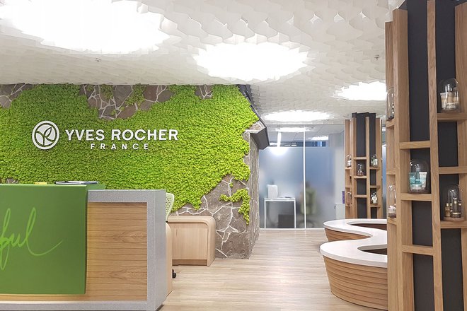 In 2017, together with the architectural bureau Plus Arch, we designed the ceilings for the new Yves Rocher office in Moscow (4th Lesnoy Lane, 4, White Stone Business Center).
