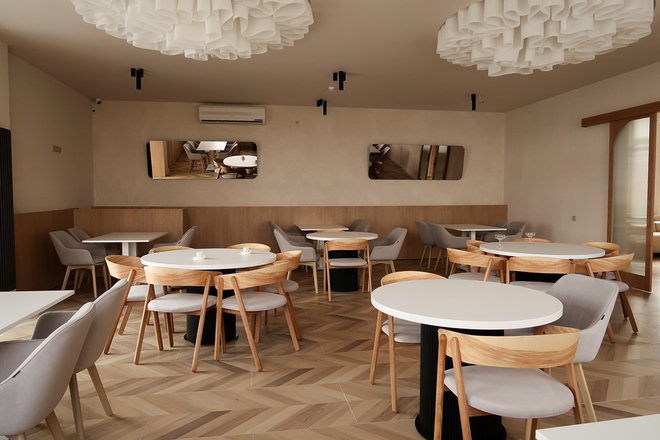 Airy islands of the Wave ceiling® decorative system have become a key accent in the new interior of the Zhemchuzhina Café.